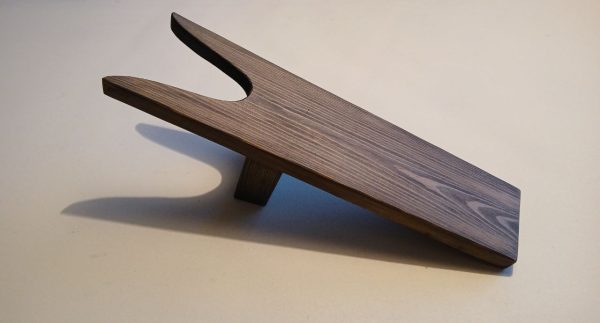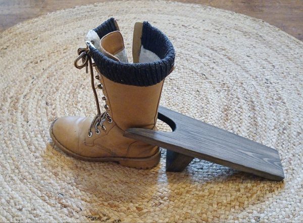 Perinteinen jalkineiden jalasta poistoon tarkoitettu apuväline. Toisella jalalla pidetään laudan alareunasta kiinni kun samalla vedetään jalkine haarukkaosan välistä.