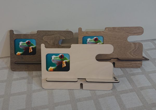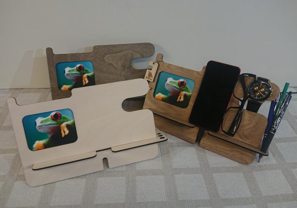 Tarviketelakka kuvakehyksellä on 3mm vanerista valmistettu ja öljyvahalla käsitelty pöytäteline johon saa kännykän lisäksi avaimet, kellon, silmälasit ja kynät yms. siististi laitettua järjestykseen. Toimitetaan 2 irrallisessa osassa jotka kootaan ilman liimaa työntämällä osat paikoilleen.